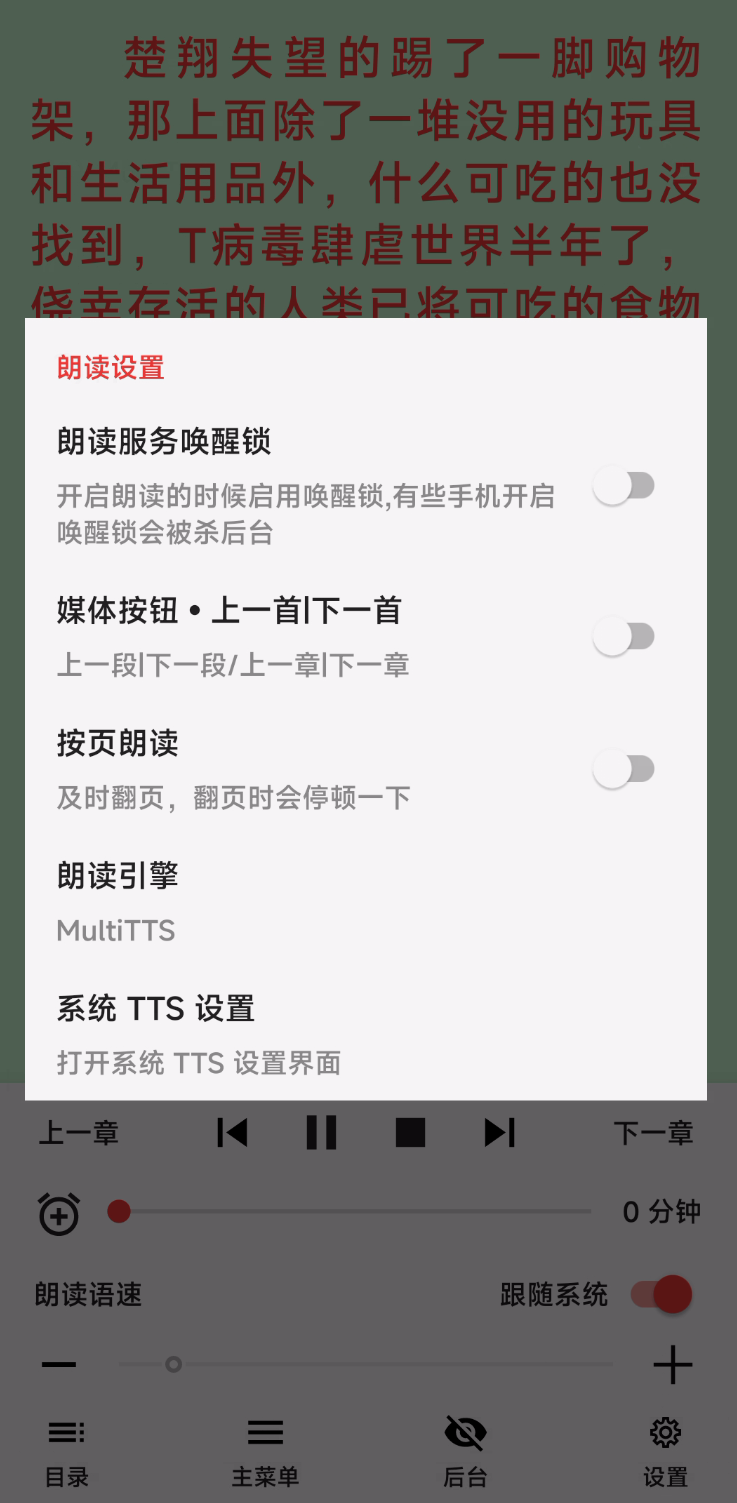 之后在其他看小说的软件里,选择用系统默认的TTS引擎或MultiTTS朗读就行。