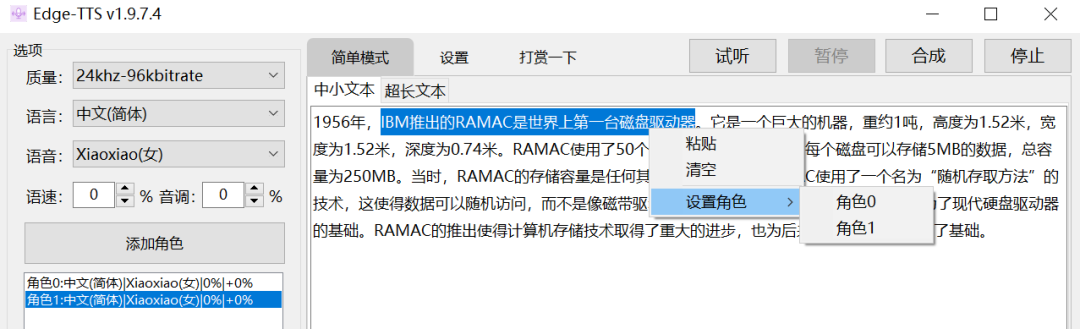 你还可以给这些音色简单设置一下语速和音调,保存成不同的角色,之后选中对应的文字右键,就能设置成不同的发音人。