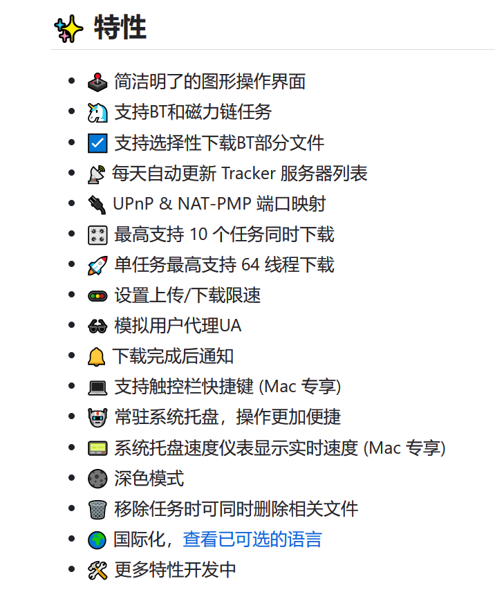 在功能上算是一个轻量级别的下载工具,支持的特性如下:
