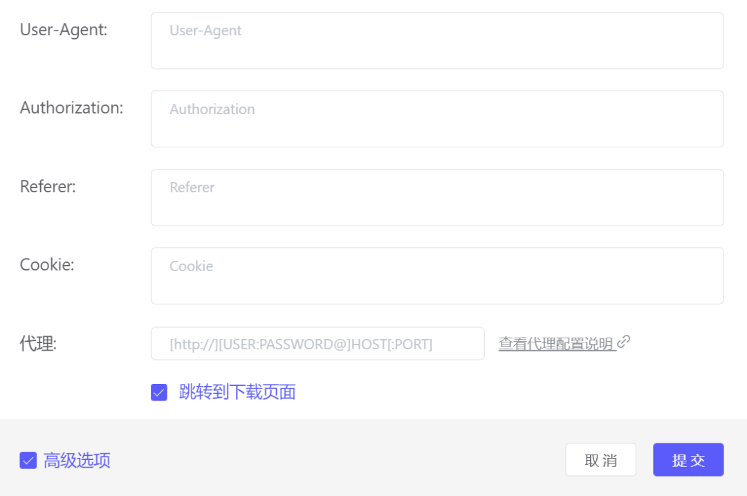 支持批量连接下载和种子文件,点开高级选项可以对下载请求进行单独设置。