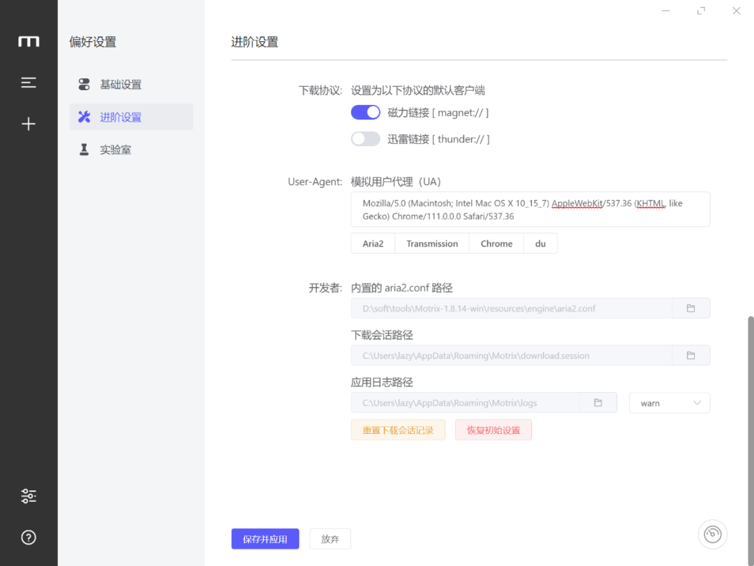 可以设置成磁力链接下载的默认客户端,也可以设置成迅雷格式的链接,这样在点开对应格式链接的时候,可以直接唤醒Motrix干活。