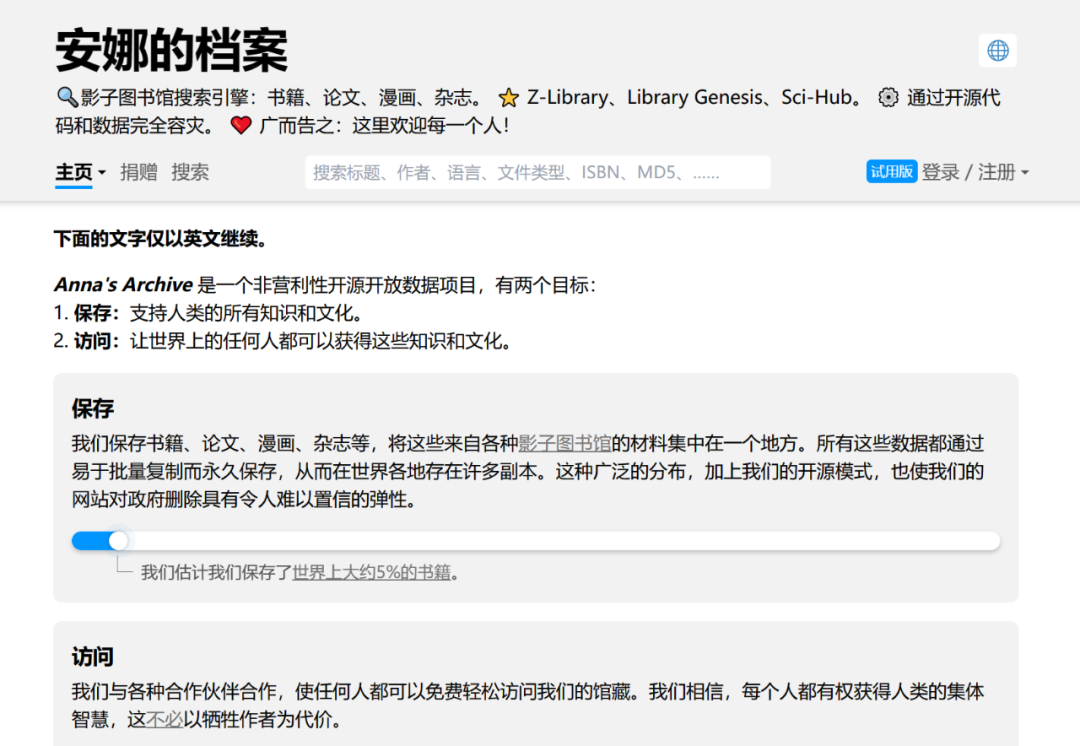 今天要说的是另一个工具,叫安娜的档案,是外国人做的一个影子图书馆搜索引擎,它里面有书籍、论文、漫画和杂志,号称保存了世界上大约5%的书籍,并且还颇有理想主义的味道,想让任何人都能轻松获取这些资源。