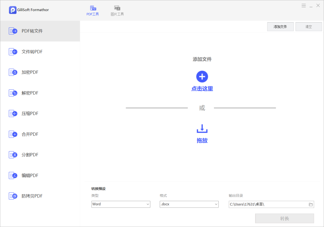 GiliSoft Formathor 的功能很多,大致可以按照 PDF 工具 和图片工具分为两大类,每一大类又可以分成很多子类。