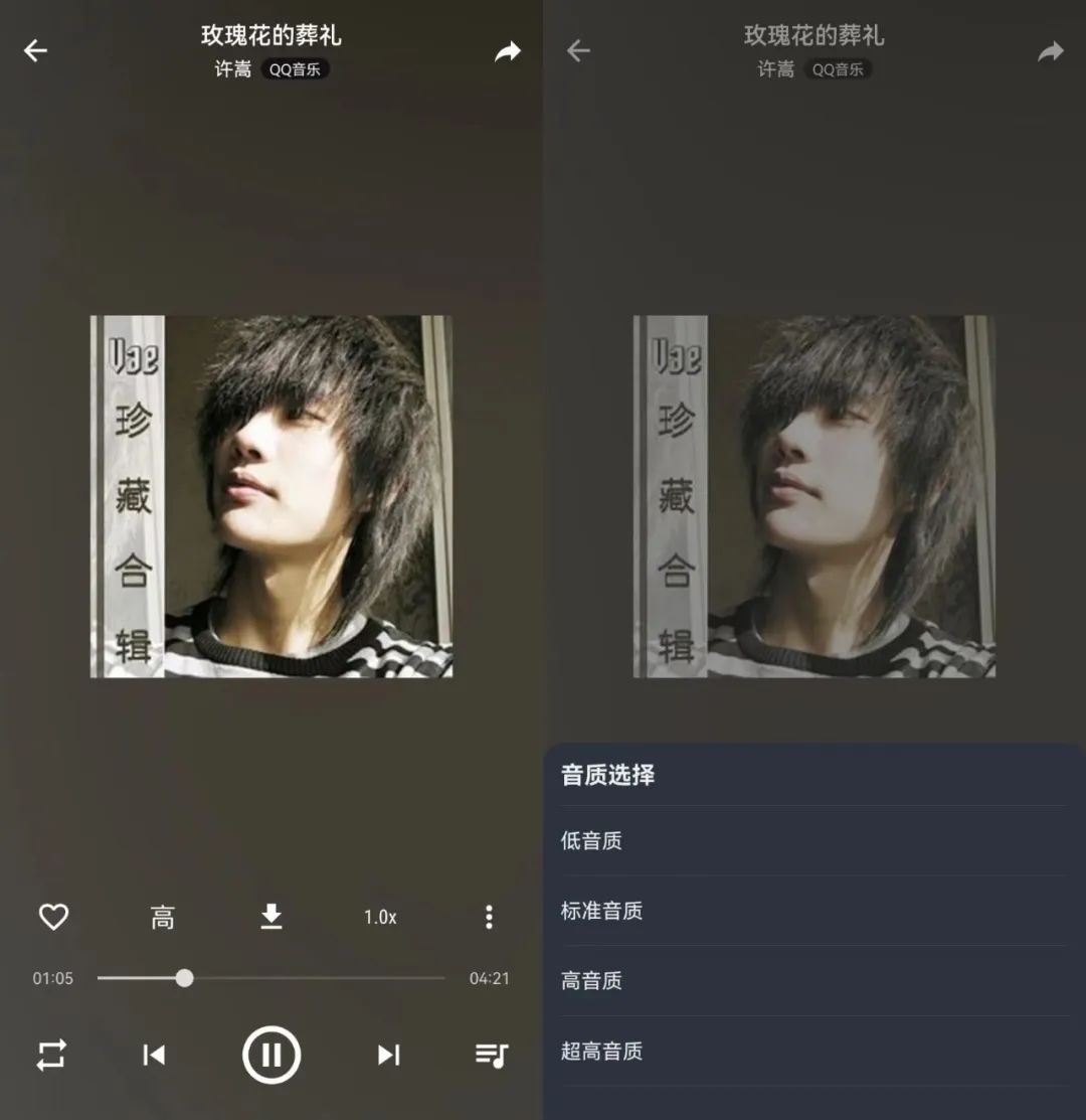 虽然 MusicFree 没有蛋播音乐那样好看的软件 UI,但是播放音乐却比蛋播音乐更好用,首先是音乐播放过程支持音质的选择,毕竟低音质和高音质听起来区别还是很大的。