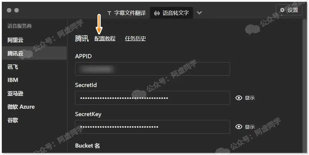 其实从下图可以看到我们还可以配置阿里云、讯飞、IBM等服务商的语音识别服务,但除了阿里云、腾讯、IBM 其他都是收费才能使用,并且 IBM 注册配置稍显麻烦,中文识别肯定没有国内服务商做的好,阿虚也不是很推荐去折腾了