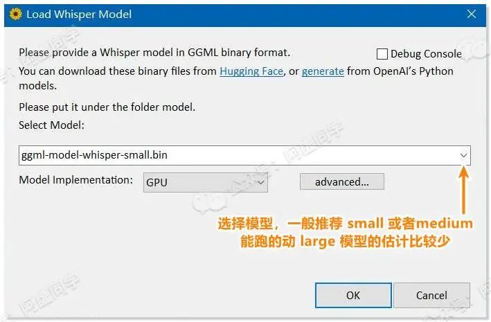 下载 WhisperDesktop 后,将 Whipser 模型文件放入软件的 model 文件夹中,运行软件会让先让你选择模型,反正就是根据自己电脑性能能跑 large 就 large,不能就依次 medium、small…往下(当然如果你的音频太长,还得自己考虑处理时间)