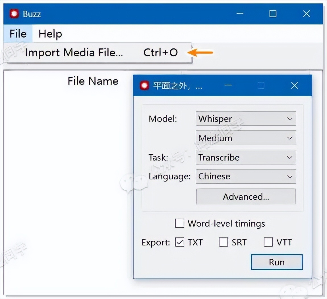 运行软件之后的使用就非常简单了,在左上角导入音频,然后选择模型、语言、输出文件格式,最后点击 Run 即可