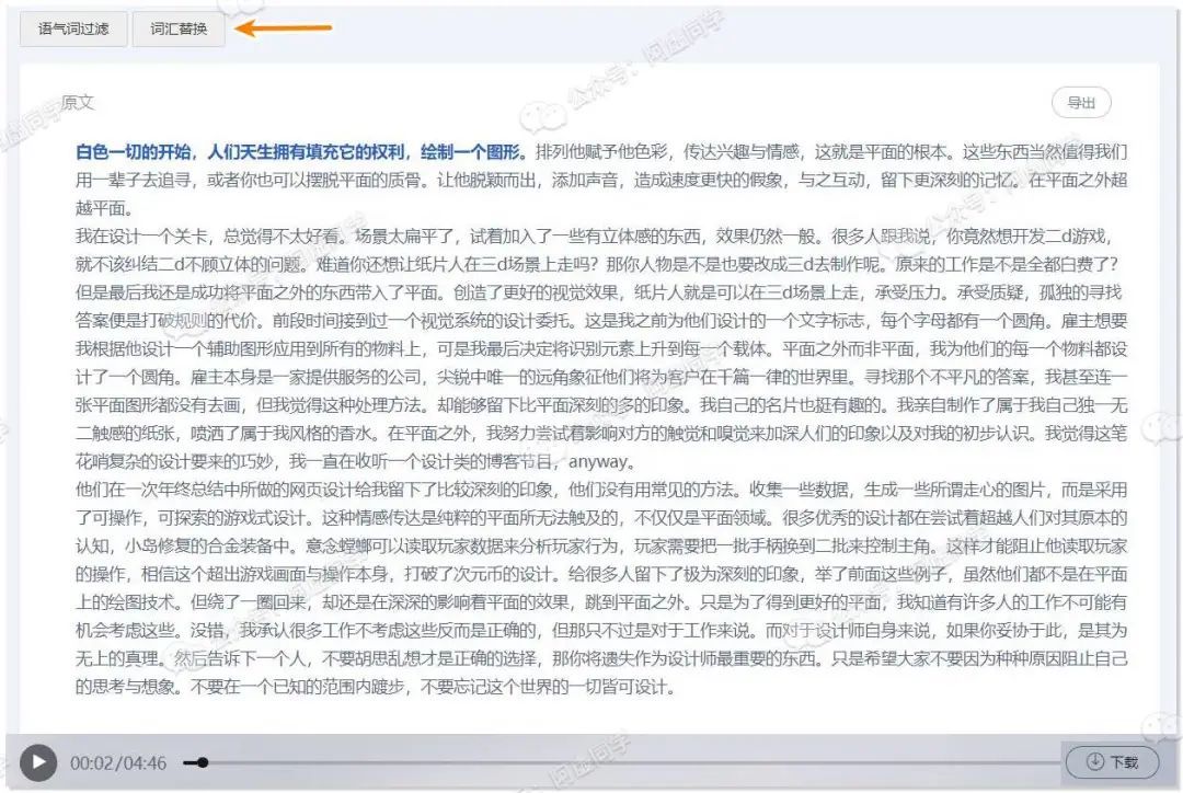 如果你发现整个文档有某些词都统一转写错了,还可以点击顶部进行「词汇替换」,同时这里也可以进行「语气词过滤」