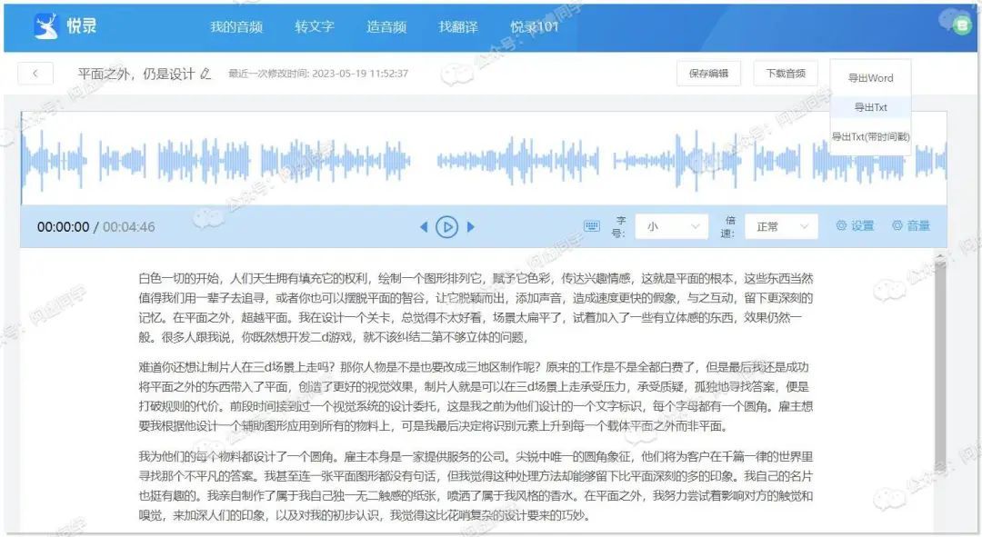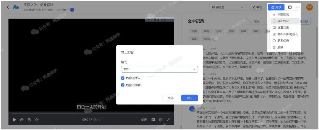 识别完之后可以在线查看,可以导出为 word 或者 txt,同时可以自行选择带不带时间戳
