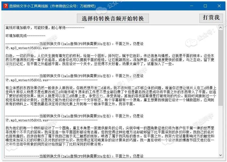 公众号@万能君的软件库基于 PaddleSpeech 开发了普通人也能一键使用的语音转文字工具,最关键的是可以离线无限次使用!