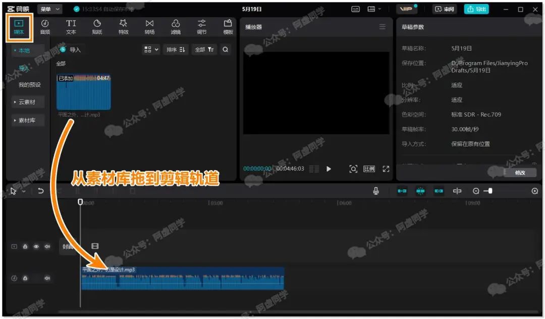 使用方法也很简单,打开软件点击 » 开始创作,把音视频文件拖入到素材库 » 再将音视频拖入到剪辑轨道