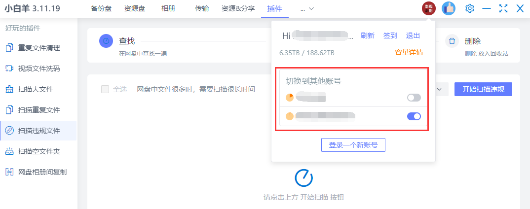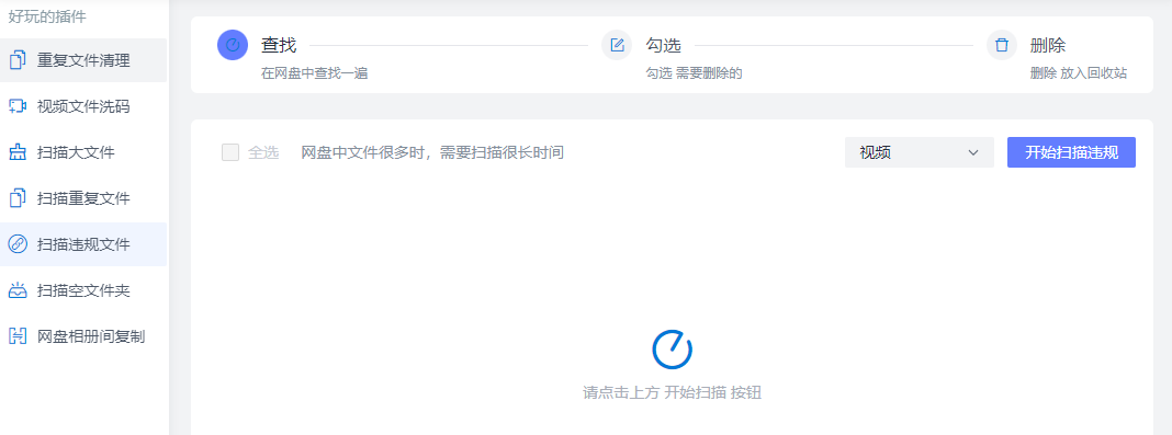小白羊支持诸如网盘内重复文件,大文件,空文件夹,违规文件扫描,视频洗码等丰富的插件。
