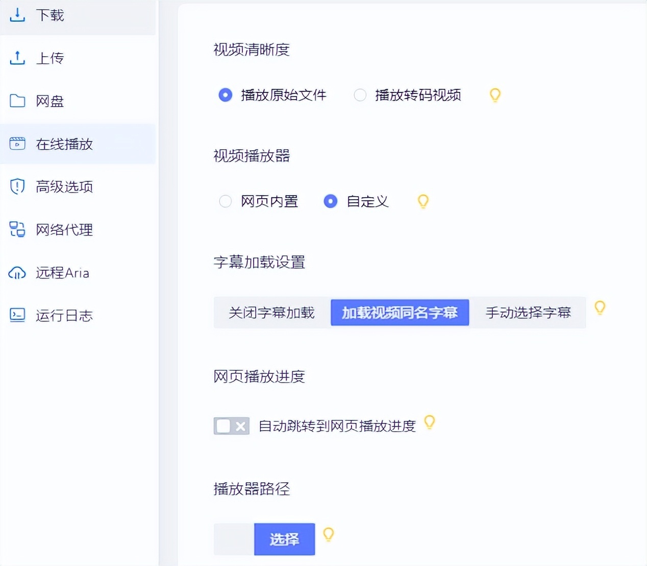 在线播放云盘中各种格式的高清原画视频。支持外挂字幕、音轨和播放速度调整,播放列表,跳过片头片尾,自动记忆播放进度。