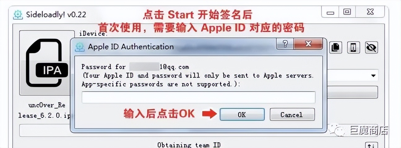 输入密码,首次使用,点击 Start,会弹出提示框,需要输入 Apple ID 对应的密码,输入后点击 OK 确定。注:如果不放心,可以新注册一个新的 Apple ID 或使用小号专门用于签名安装。