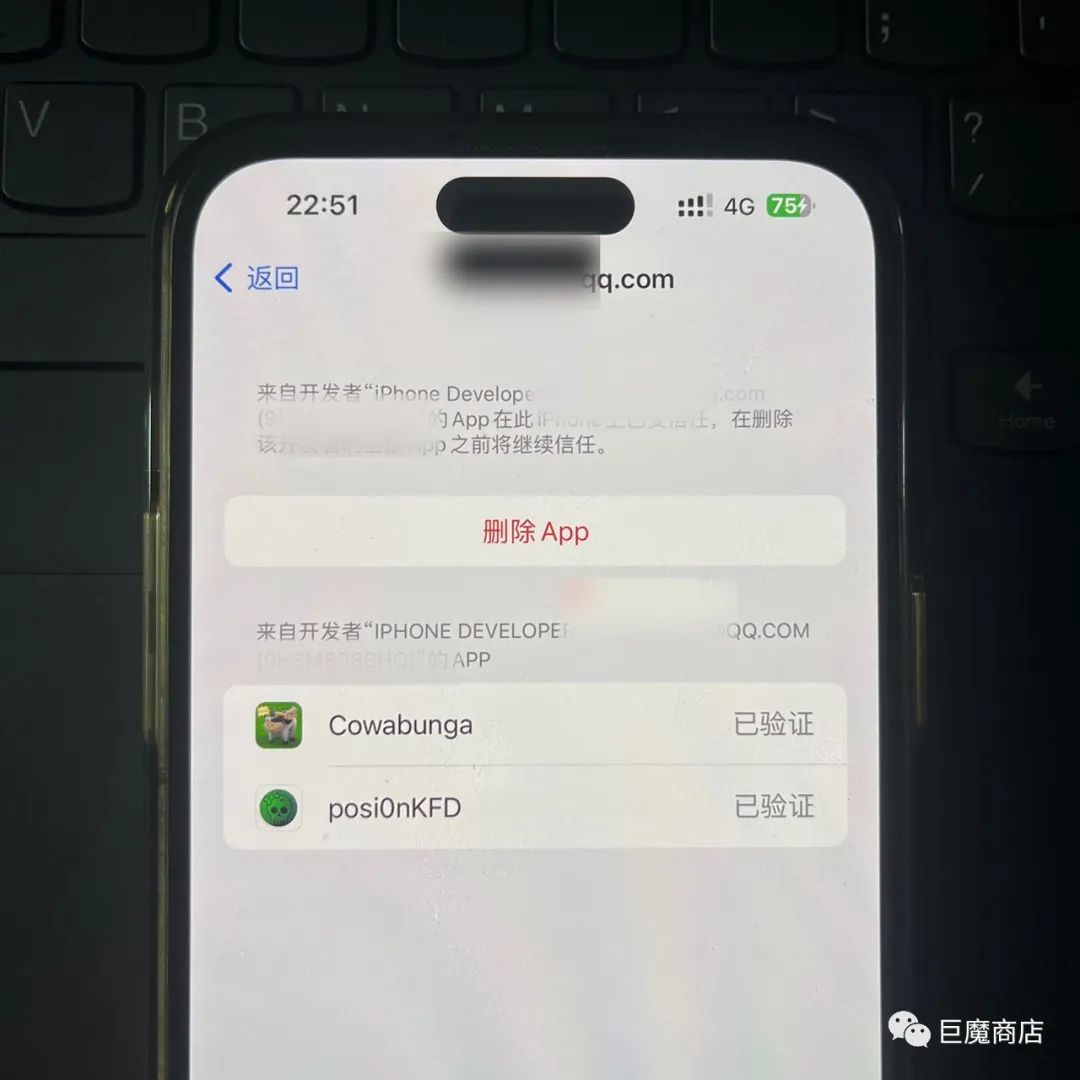 接着我们在手机上点击打开Cowabunga会显示“不受信任的开发者”,我们需要信任证书后才能使用。