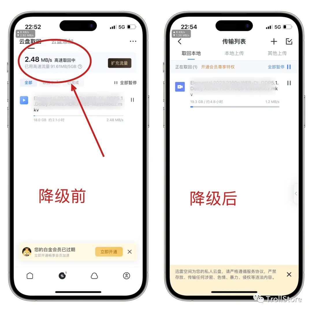 那么,为什么有一些人会选择app降级呢,那是因为升级app以后才发现不好用,所以才会降级,比如说上图,更新了版本以后才发现,本来不限速的变成了超过多少就要限速,你想要快.可以啊,得vip