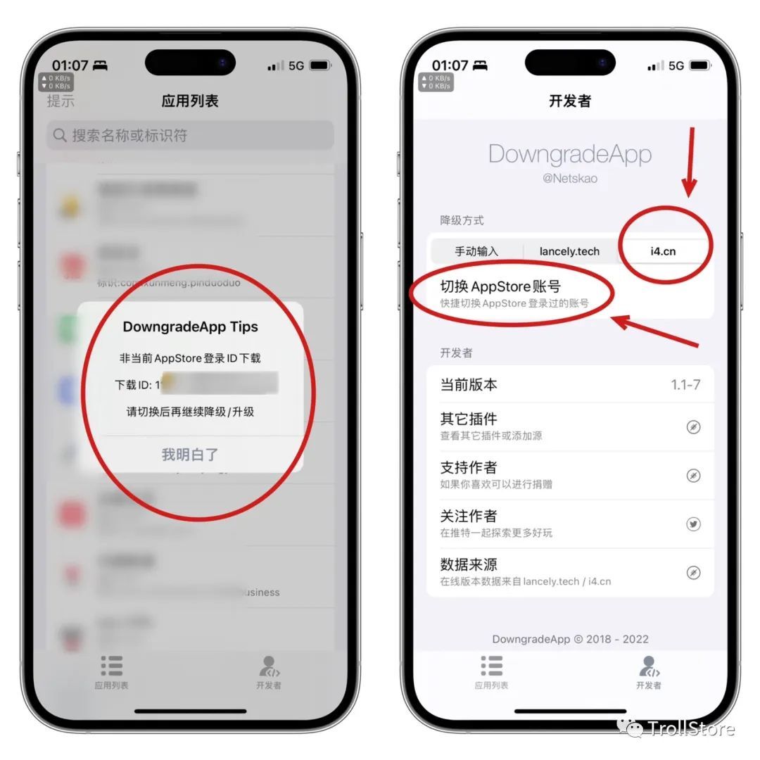 再回到DowngradeApp上,说说注意事项,如果你点开某个app提示上图这个弹窗,你只需要点击右下角开发者,点击切换App Store账号即可,也就是说你这个app用的哪个id下载的你就需要切换到哪个id,其次,(点击降级没有反应)降级方式,(上图所示)如果你是选择降级国内的app选择i4.cn,倘若是国外的app选择lancely.tech吧,反正只要选择这两个模式其中一个模式以后点击app会弹出来版本号就行!