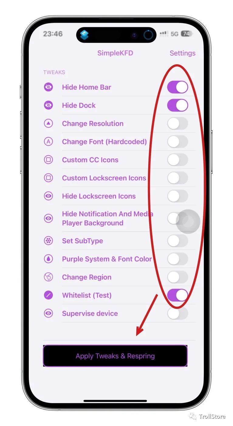 我们选择好要设置的功能,点击底部的Apply Tweaks & Respring即可!如果点击就闪退或者重启,可以手机关机重启,再多试一试,还不行就暂时先放弃吧!因为有可能是工具不兼容你的设备和系统。也有可能工具所添加的偏移量不正确。无解,等后续更新版本再试试看吧。