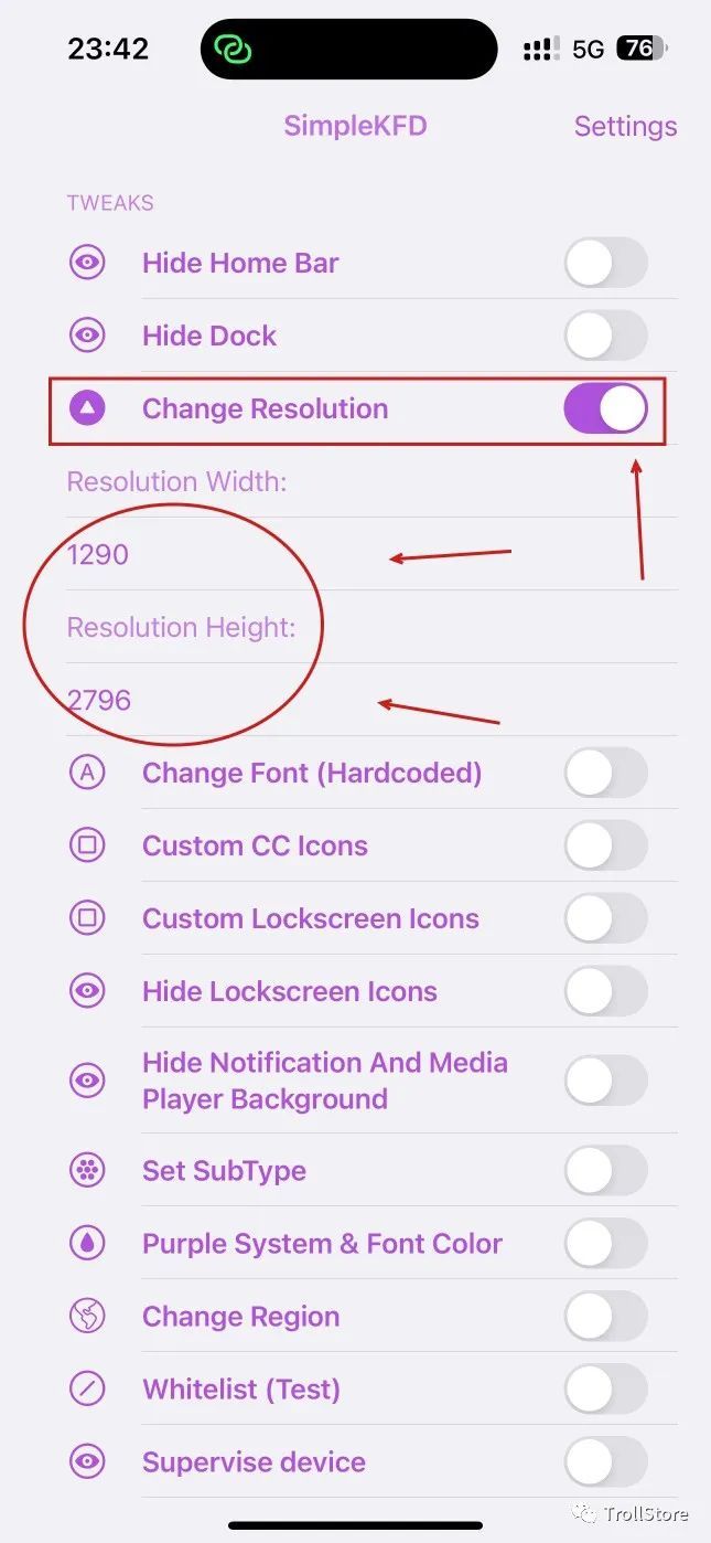隐藏小横条。Dock 背景透明。修改分辨率。更改字体。更改控制中心图标。自定义锁屏手电筒和相机图标。隐藏锁屏手电筒和相机图标。隐藏通知和媒体播放背景。设置子类型,老设备一键开启灵动岛(iOS 15 系统请勿使用)。紫色系统和字体颜色。改变区域。白名单,一键解除证书被拉黑。进入或去除监督。