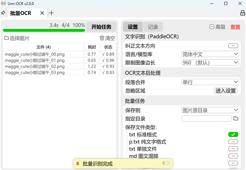 支持批量导入本地图片并识别,识别内容可以保存为 txt / jsonl / md / csv(Excel) 等多种格式。