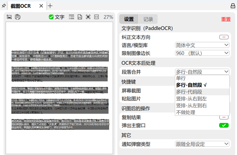 此外,也可以设置不同段落合并,其中多行-自然段:智能识别、合并属于同一段落的文字,适合绝大部分情景,在记录里边可以看到识别的结果。
