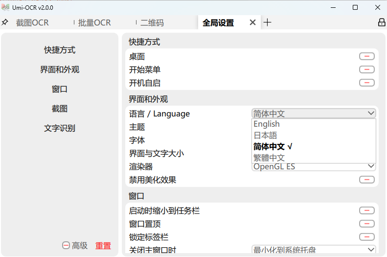 Umi-OCR 支持的界面多国语言,在第一次打开软件时,将会按照你的电脑系统设置,自动切换语言。如果需要手动切换语言,请参考下图,全局设置 → 语言/Language 。