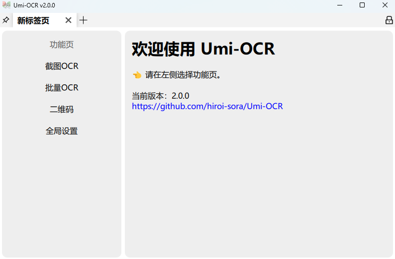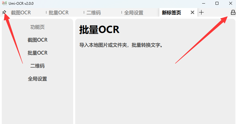Umi-OCR v2 由一系列灵活好用的标签页组成,类似浏览器的标签页,签栏左上角可以切换窗口置顶,右上角能够锁定标签页,以防止日常使用中误触关闭标签页。