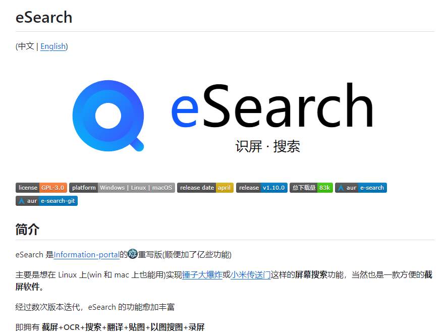eSearch(点击跳转)是一款开源工具,全平台覆盖,功能全面,除了能够支持 OCR 识别,还支持截图、录屏、截图搜索等多种功能,简直可以称得上全能型神器!