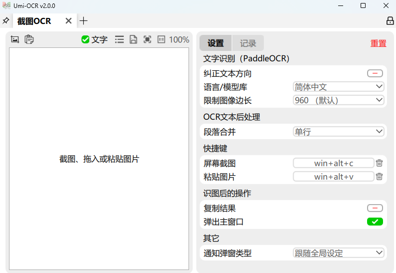 打开截图 OCR 界面,开源直接调用快捷键 win+alt+c 进行截图,然后 win+alt+v 粘贴识别,也可以自行设置热键。
