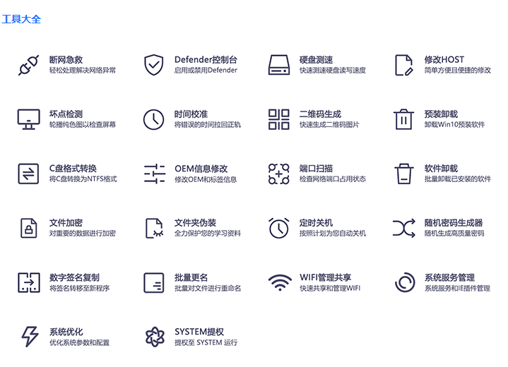 这个就非常全面了,现在最新版本,已经有 22 种不同类型的工具,实用工具应有尽有。断网急救、硬盘测速、修改 HOST、时间校准、文件加密、批量改名、预装卸载、软件卸载、文件夹伪装、定时关机、批量更名等等,它几乎集成了一个工具箱该有的全部功能。
