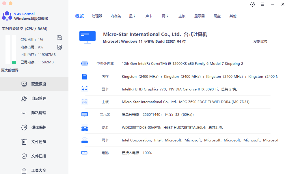其中实时性能展示包括 CPU 占用、内存占用、可用内存和已用内存实时展示,配置概览包括整台电脑概览、处理器、内存条、显卡、主板、显示器、硬盘、网卡、声卡、以及更多的基本信息。
