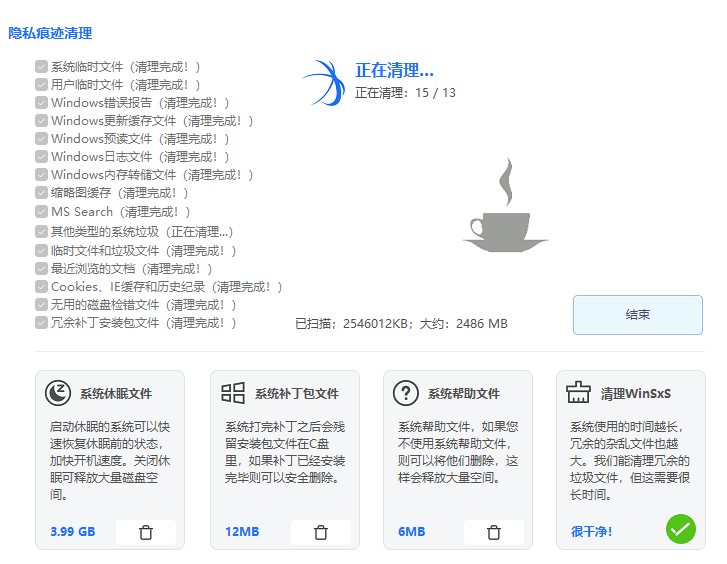 可以一键清理系统使用痕迹以及个人隐私,此外还可以清理系统休眠文件,建议经常清理。