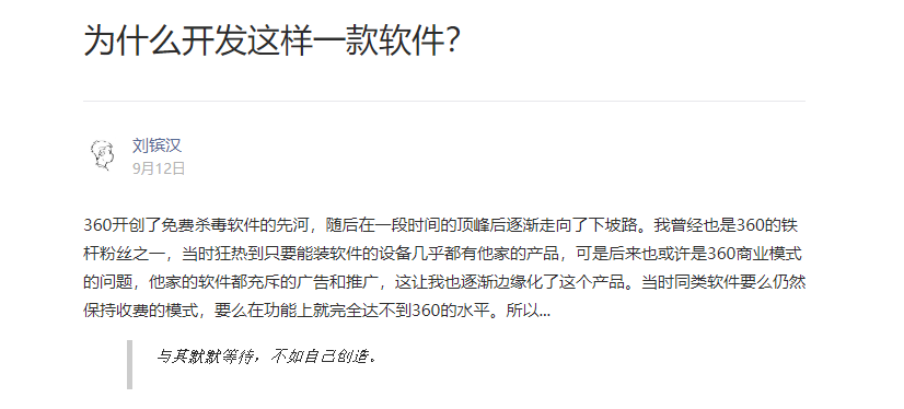 360 开创了免费杀毒软件的先河,随后在一段时间的顶峰后逐渐走向了下坡路。我曾经也是 360 的铁杆粉丝之一,当时狂热到只要能装软件的设备几乎都有他家的产品,可是后来也或许是 360 商业模式的问题,他家的软件都充斥的广告和推广,这让我也逐渐边缘化了这个产品。当时同类软件要么仍然保持收费的模式,要么在功能上就完全达不到 360 的水平。所以…与其默默等待,不如自己创造。
