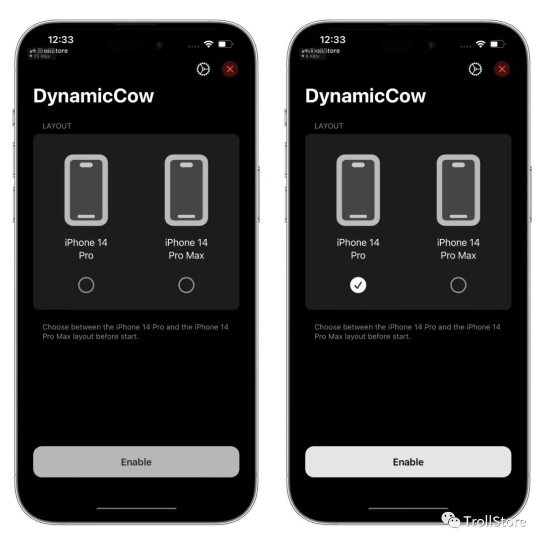 安装好DynamicCow以后打开它,打开可以看到以上界面,上面我们随意测试一下,我测试设备是iPhone 13 ,我们点击iPhone 14Pro☑️勾选,再点击enable ,手机会菊花重启一下。