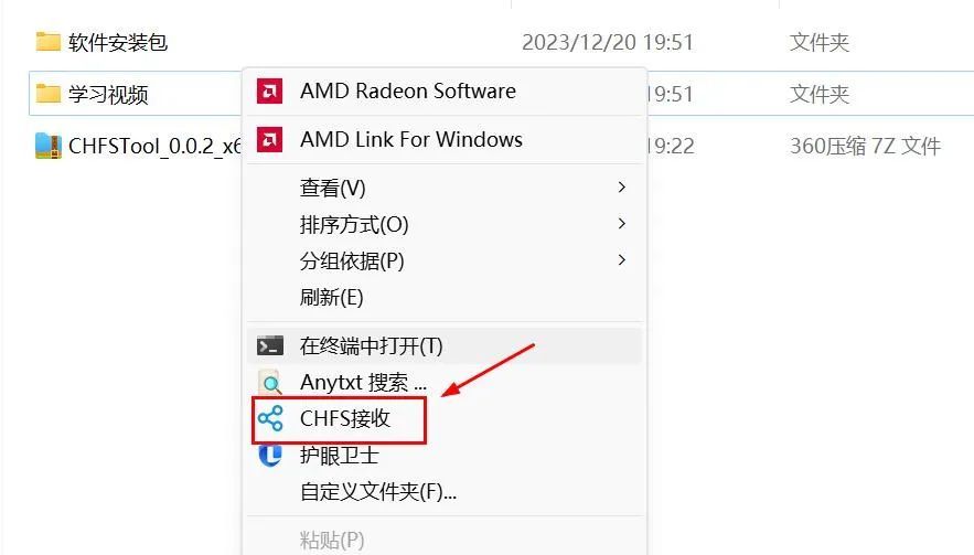 创建好chfstool右键菜单后,你在电脑上任意文件或文件夹上右键点击时,会看到一个名为”CHFS传输”的选项出现在菜单中,点击该选项后,系统会生成一个二维码。你可以使用手机浏览器或微信扫描该二维码,将文件或文件夹下载到手机上。