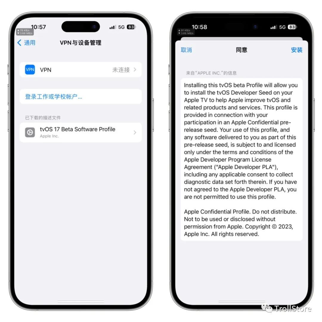 然后打开设置通用设备管理,点进去tvos17,点击右上角安装