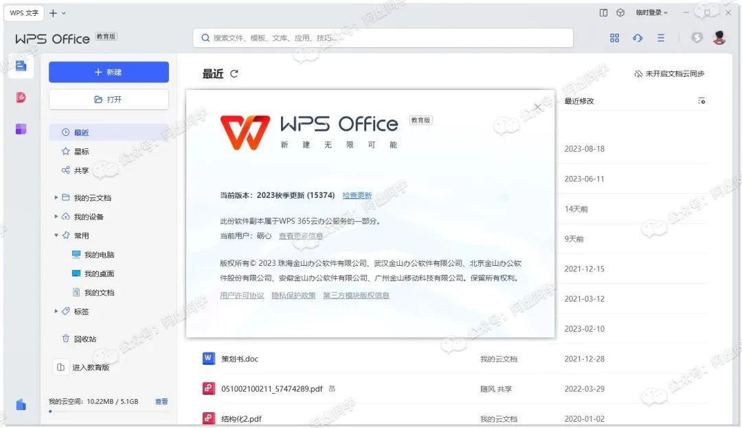 而WPS 2019 打开为WPS 2019教育版11.8.2.12094,支持Excel VBA宏功能,可正常登录使用WPS云文档功能,但是2024年2月13日就到期了,不清楚校方到时会不会续期