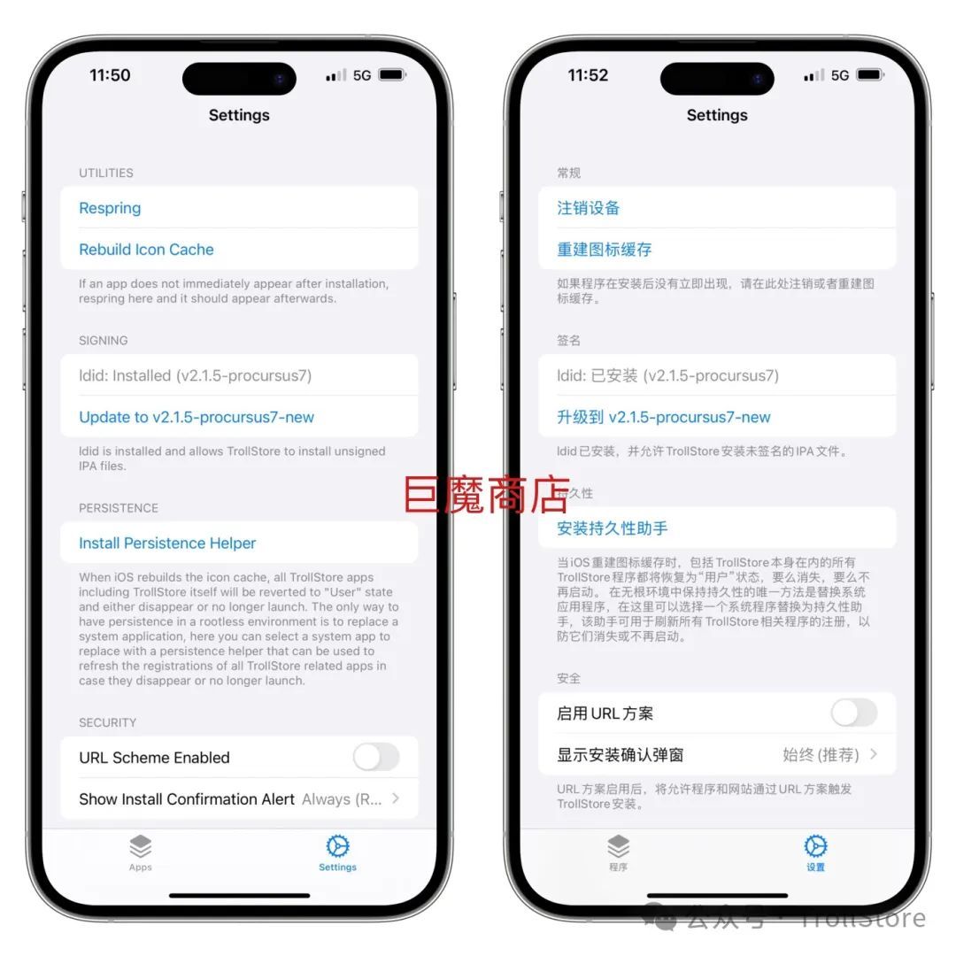 上图就是汉化前后对比,其实只要你稍微了解一下TrollStore 你就知道它是一款非常简单易懂的工具,汉不汉化都无所谓,这个还是看你们哈。