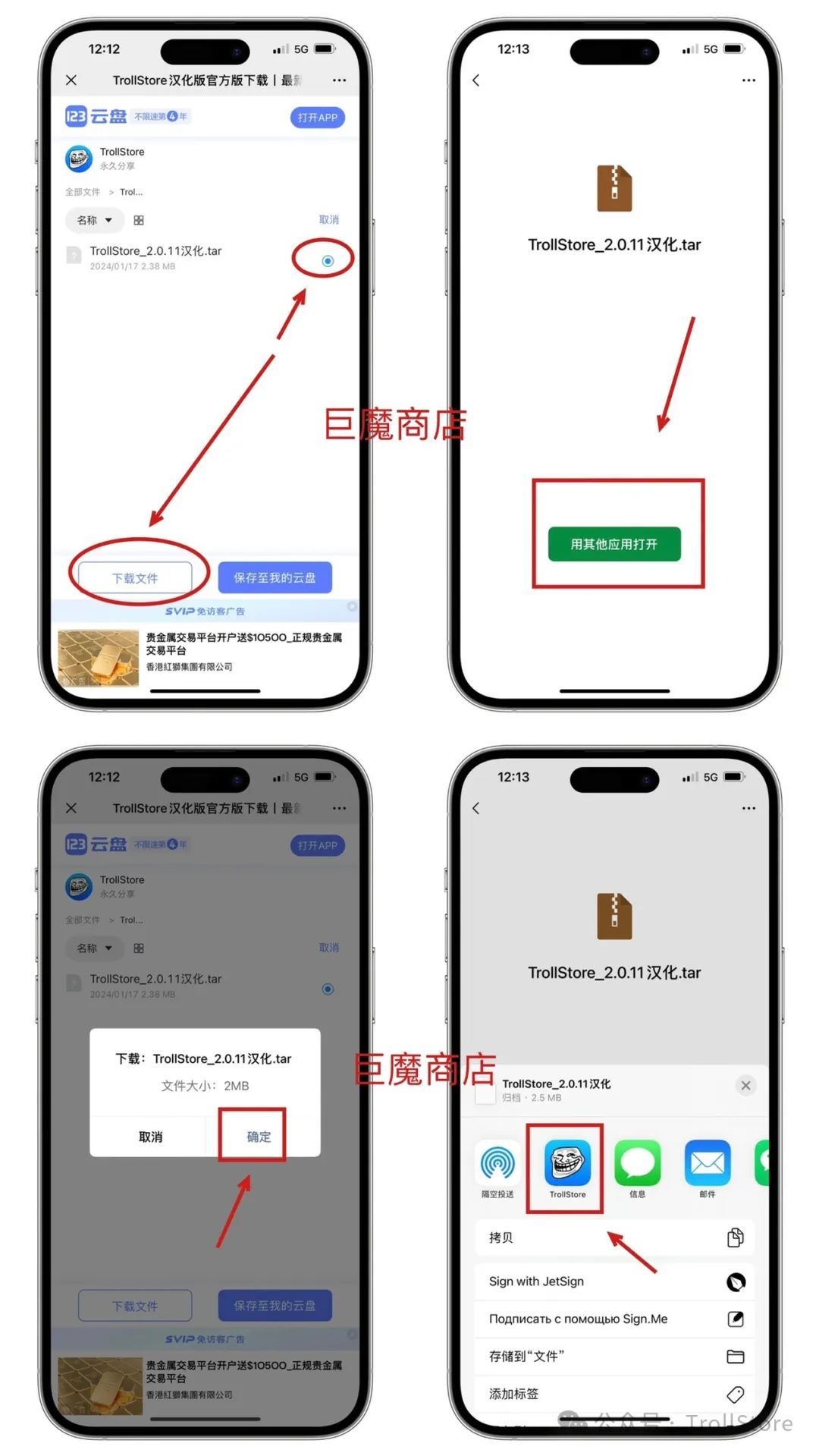 点击文件夹以后可以看到TrollStore 2.0.12 tra 汉化包,我们勾选它,默认是勾选了的。点击下载文件,下载好了以后点击用其他 应用打开 最后点击用TrollStore 打开会注销一下就成功了。