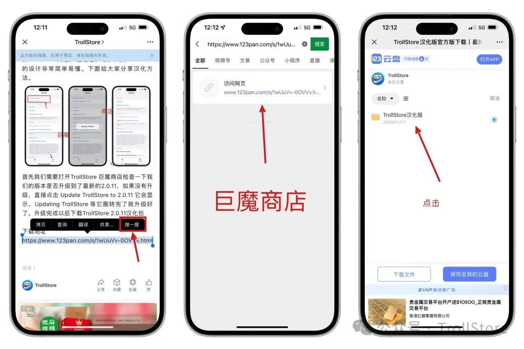 我们不用复制上方下载地址在浏览器打开,直接在文章中长按下载地址然后点击 搜一搜 点击访问网页 再点击TrollStore 汉化版文件夹