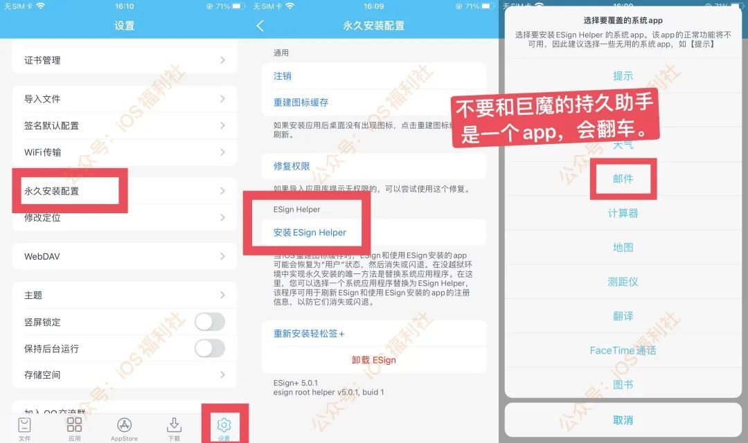 先打开轻松签+的设置-永久安装配置-安装Esign Helper,随便选择一下你用不到的APP,小编这里就以”邮件APP”为例。