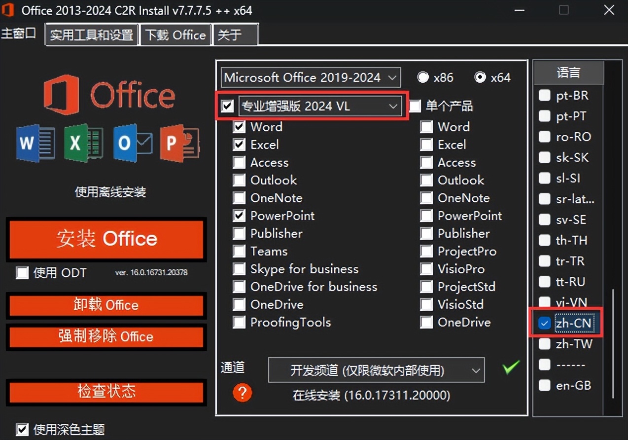 选择产品版本了,勾选需要安装的程序,中文语言即勾选 zh-CN,接着点击安装 Office 即可。