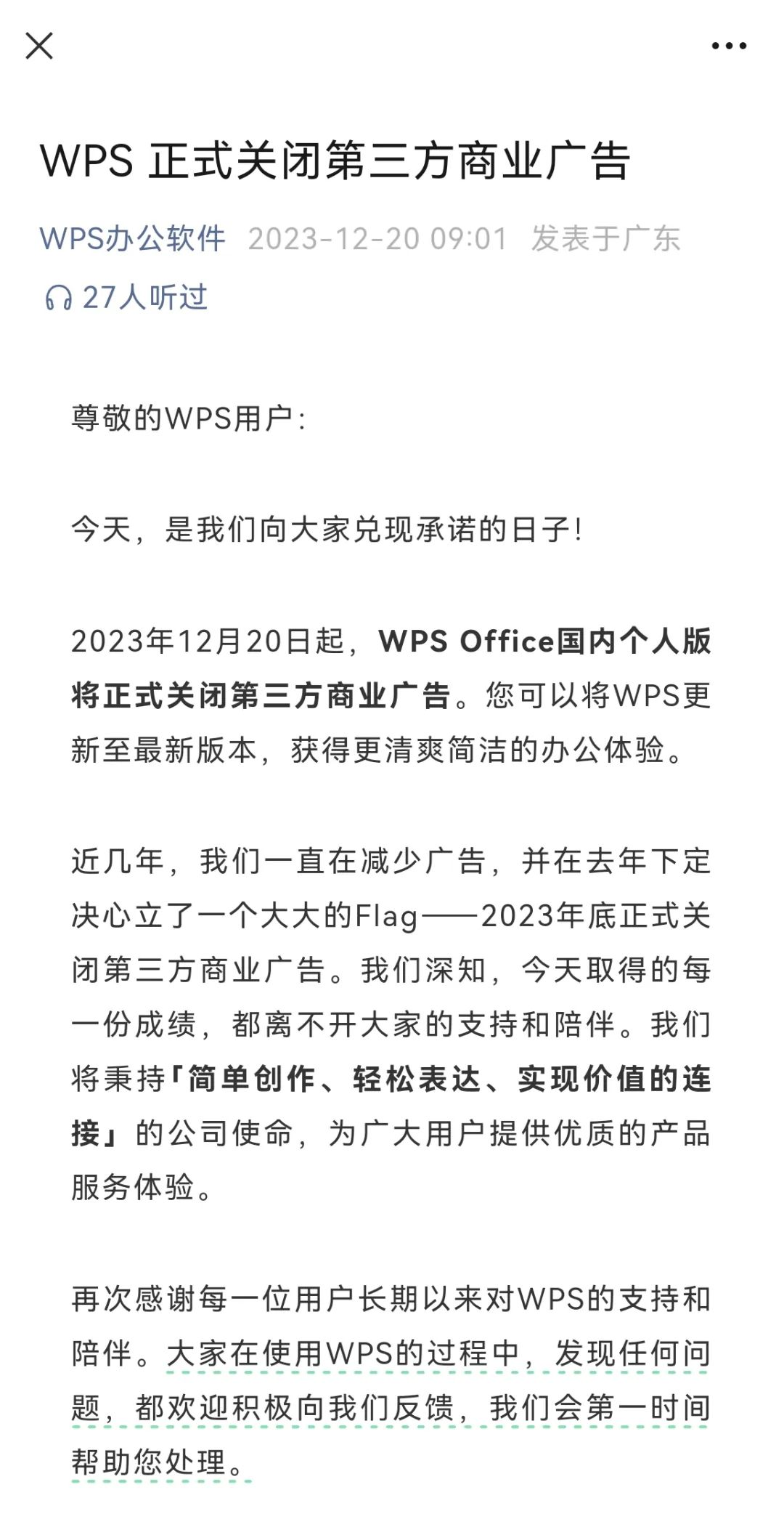 在早些的时候,金山旗下免费版的 WPS,无论 PC 端还是手机端的都会有广告。而在上个月,WPS 官方在公众号发布正式关闭第三方商业广告通知,至此,WPS 体验又进一步提升了。