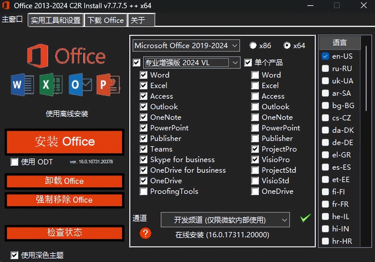 软件可以在线下载安装 Office 2013-2024 的各个版本,离线安装部署 Office 镜像,自定义安装 Office 产品组件,支持 Office 零售版转换批量许可版,在线 KMS 激活 Office,可选内置 Office 密钥许可证安装。