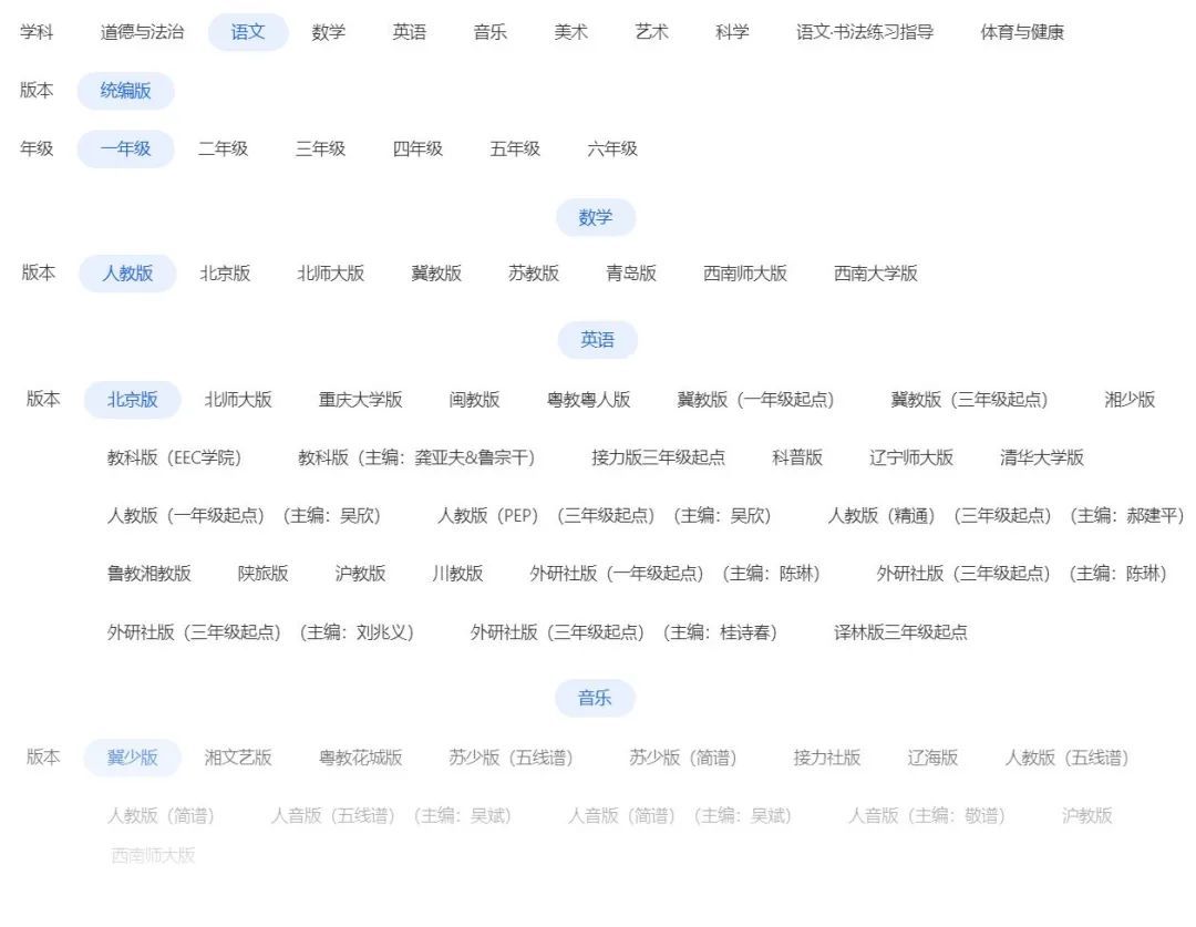 虽然没有详尽的版本分类,但通过年纪和教材封面相信你还是能轻松找到你需要的教材