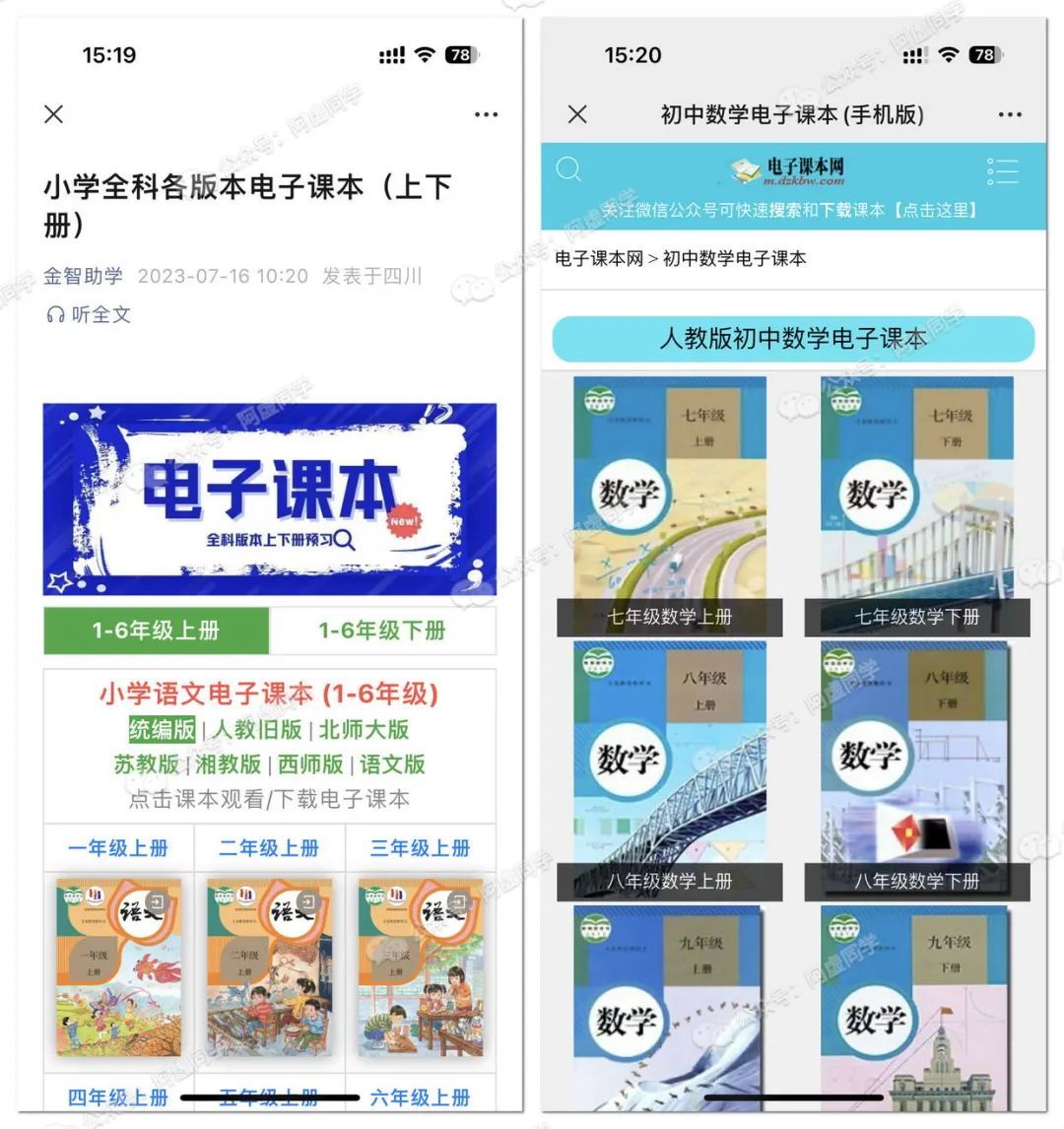 除了上述渠道,微信上其实很多公众号都有分享中小学的电子课本资源,比如电子课本网、金智助学等等,一些可能是直接把教材以图片型式发布在公众号文章上,一些可能是直接提供的网盘资源,总之其实随便一搜都能轻松找到可用资源