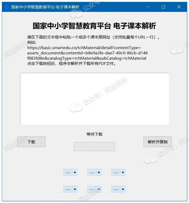 软件界面如下,输入国家中小学智慧教育平台教材的链接即可解析下载,还支持解析批量下载(一行一个):