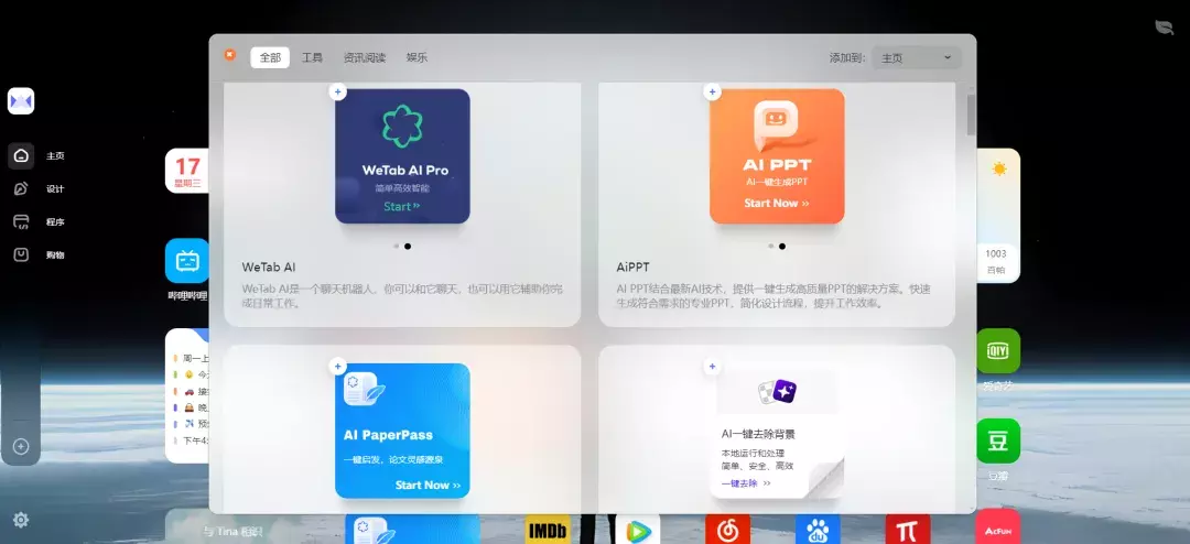WeTab作为一款国产新标签页插件,在颜值、功能上都带来了令人意想不到的体验。