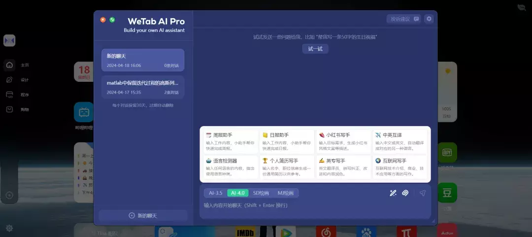 WeTab AI小组件的对话功能由原生GPT 3.5和GPT 4.0提供支持,支持联网,即开即用。