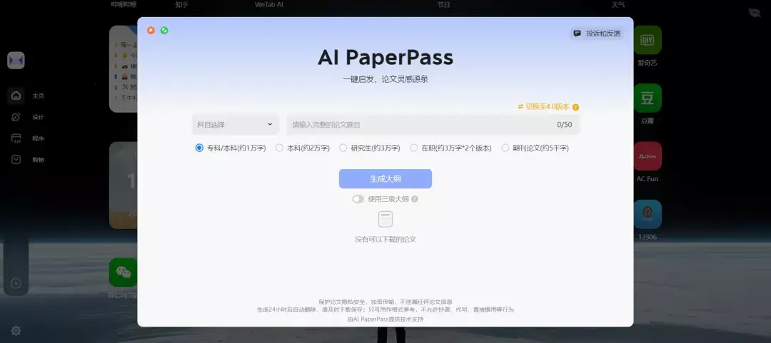 眼看着DDL了,不妨试试一键生成论文。打开WeTab的AI PaperPass组件,在线输入关键词,就能智能生成详细的大纲。